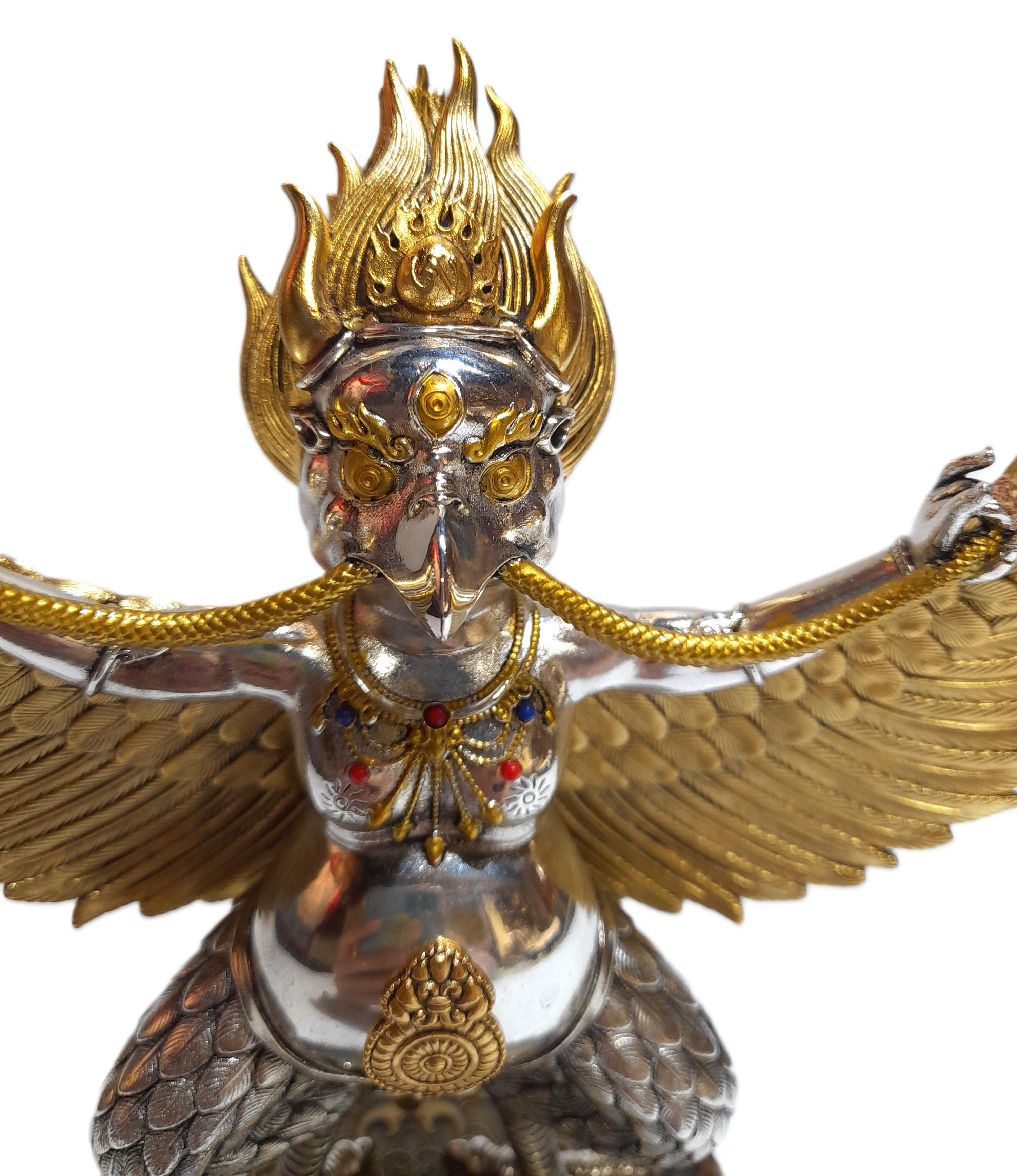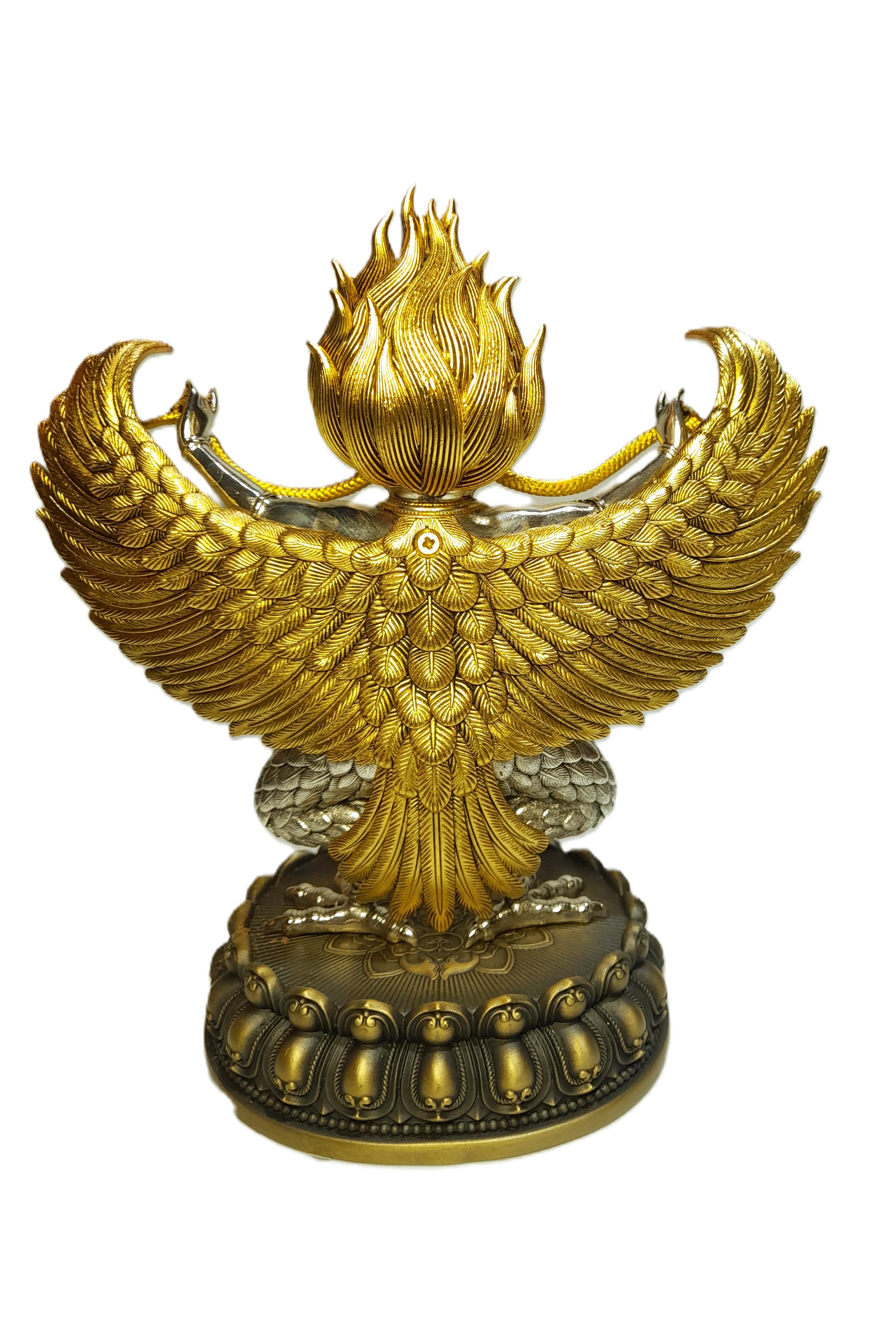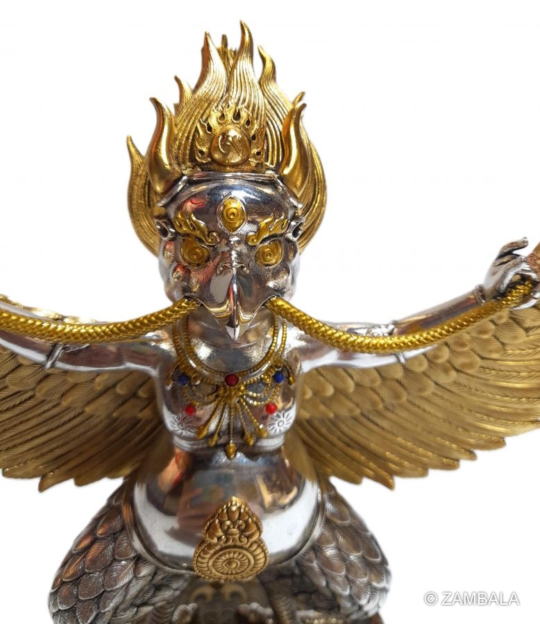 在藏傳佛教中,**金翅鳥**(迦樓羅,梵語:Garuḍa)是一種強大的護法神祇,屬於**天龍八部**之一,象徵**威力、勇猛與驅除障礙**。它的形象源自印度神話,並在佛教傳統中演變為護持佛法的神聖存在。