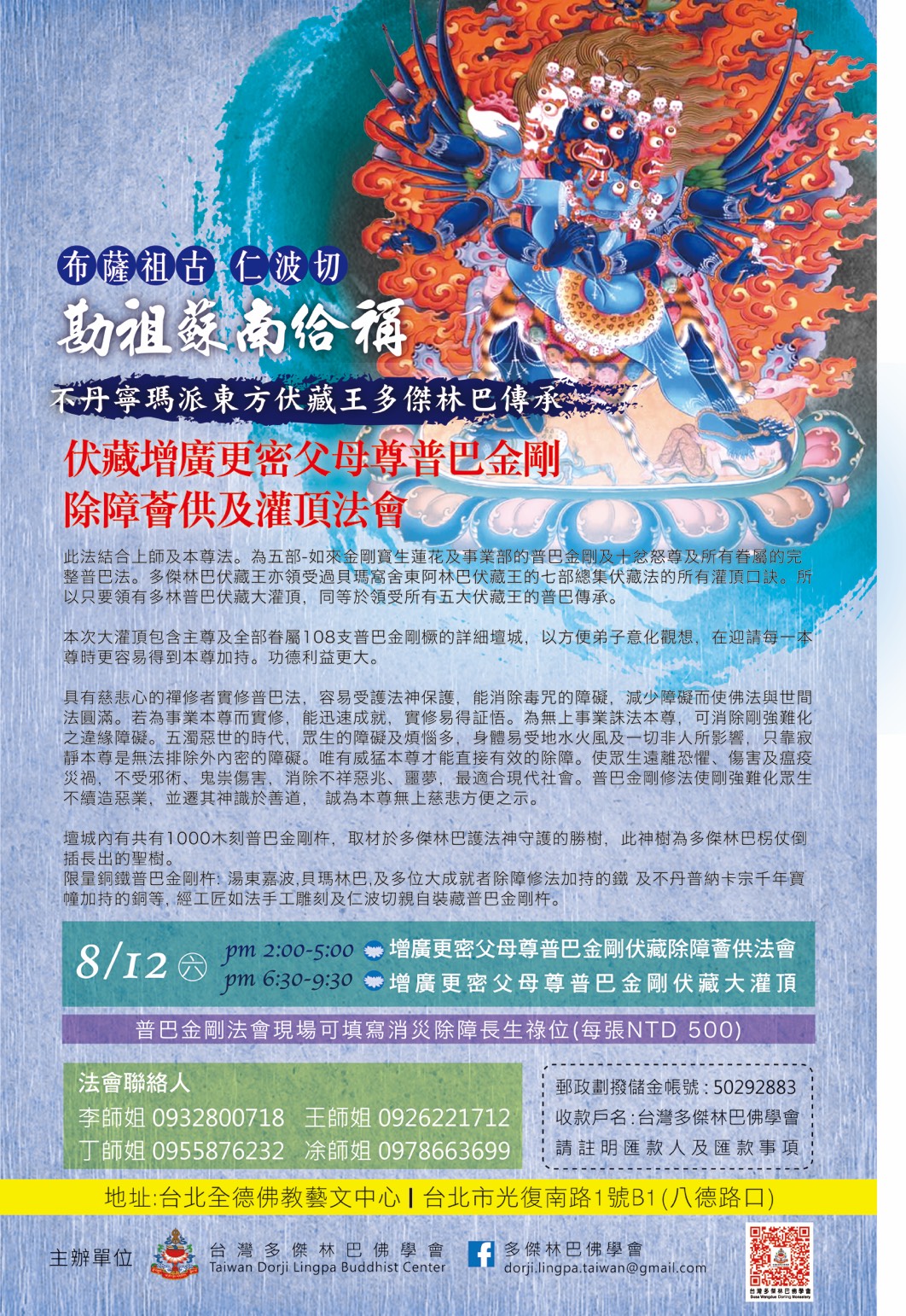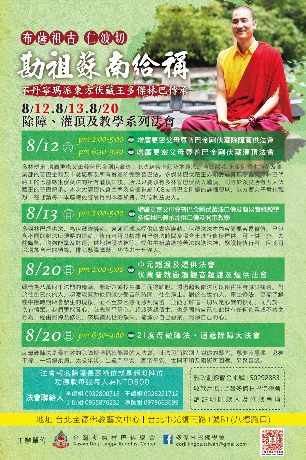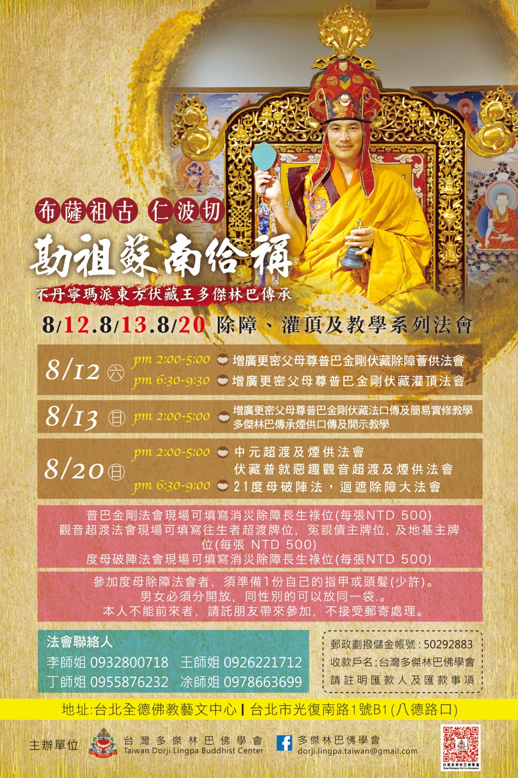 | 除障、灌頂及教學系列法會 8/12, 8/13, 8/20 (布薩祖古 仁波切 ;不丹寧瑪派東方伏藏王多傑林巴傳承 |