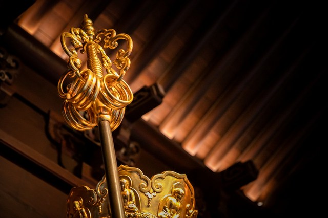 錫杖是佛教出家僧侶所持的一種法器,上面裝飾有金屬環,搖動時會發出聲響。