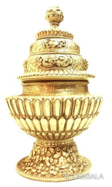 修法米罐通常由金屬製成,如銅或鎏金,並且可能刻有咒語或佛教象徵,以增強其法力。使用時,修行者會在米罐中放入米粒,並誦持特定的咒語,如「變食真言」,使食物變得充滿法力,能夠遍及十方,利益眾生。