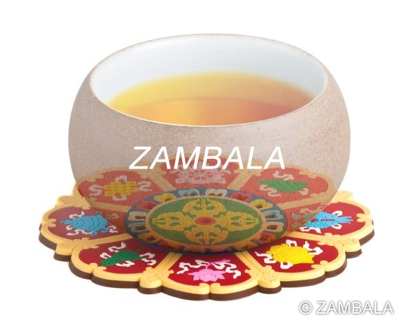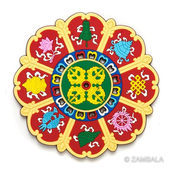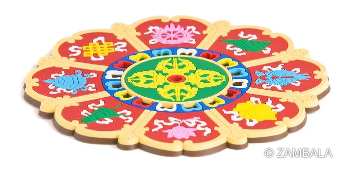 - 將八吉祥杯墊平置於佛壇前,面向佛像,象徵吉祥護持。