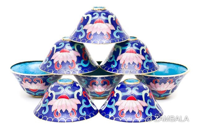 景泰藍八供杯是藏傳佛教中常見的供養器具,以中國傳統掐絲琺瑯工藝(即景泰藍)製作而成。景泰藍工藝起源於元代,由拜占庭經伊斯蘭地區傳入中國,明代景泰年間達到巔峰,清代宮廷因崇信藏傳佛教而廣泛應用於佛教器物製作,如供杯、佛像等。這些杯子通常成組八個,用於盛放八種供品(簡稱八供),是佛教徒日常修持的重要部分。下面我從其在藏傳佛教中的影響地位,以及神話故事由來進行敘述。