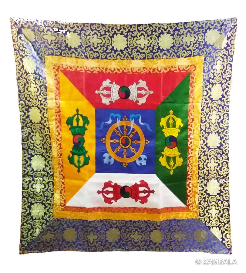 - **藏傳佛教的影響(7世紀起)**:在西藏,桌布稱「chog tsher」(藏文:ཆོག་མཚོན་),源自苯教傳統的祭壇布,後融入密宗。這些布料多為手工織染,圖案包括壇城曼陀羅、金剛杵或護法神像,用於修法時營造神聖氛圍。現代尼泊爾與西藏出口的佛桌桌布,常見厚實棉質,尺寸約80-100cm方形,源自8世紀蓮花生大士傳入的密宗儀軌。