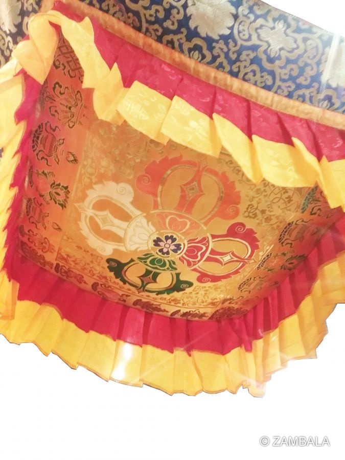 - 例如,在達賴喇嘛或噶瑪巴的主持法會中,常見法座後方或上方有華麗的黃色傘蓋布幔,營造莊嚴氛圍。