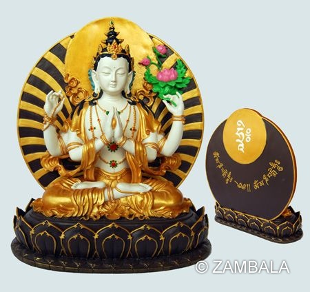 它被認為是三合一,作為一個可以可視化的觀音,種子音節,並在後面的中英文和藏文六字真言。