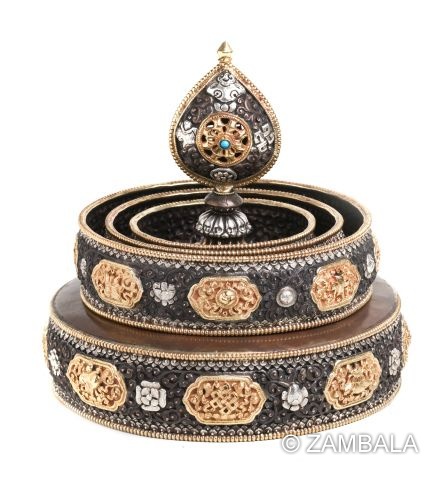 曼達盤通常由多層塔盒和螺頂組成,每層塔盒中空,可裝滿金銀、寶石、糧食等供物。修法時,修行者一邊誦念真言,一邊將供物撒入曼達盤中,逐層堆疊至螺頂,象徵祈願吉祥幸福。