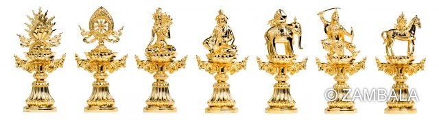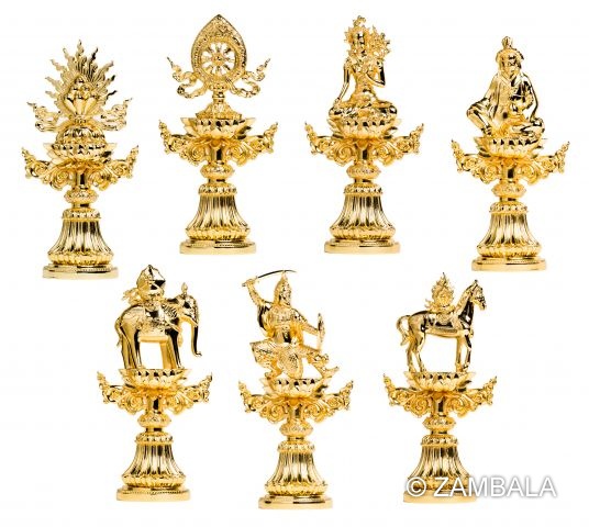 - **在供養儀式中的應用**:七政寶常以實物或象徵形式(如金屬或寶石雕刻的法器)置於壇城(mandala)或佛壇上,作為獻供的一部分。修行者透過觀想或實際擺放這些寶物,來表達對佛法的虔誠與布施之心。例如,在藏傳佛教的供養儀軌中,七政寶被用來象徵「大圓滿七覺支」(七菩提分),包括擇法覺支、捨覺支、精進覺支、喜覺支、念覺支、定覺支與慧覺支,幫助克服修行障礙,通往覺悟之路。 這種象徵性使用不僅限於個人修行,還出現在寺廟的法會、灌頂儀式或節慶活動中,強化佛教的王權觀與智慧傳承。