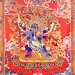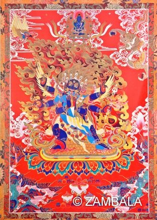 雙腳分別踩踏男女人形,代表降伏空有、偏執,懷抱藍膚佛母。身後的翅膀象徵一把銳利的刀,可以斬斷愚痴妄見!