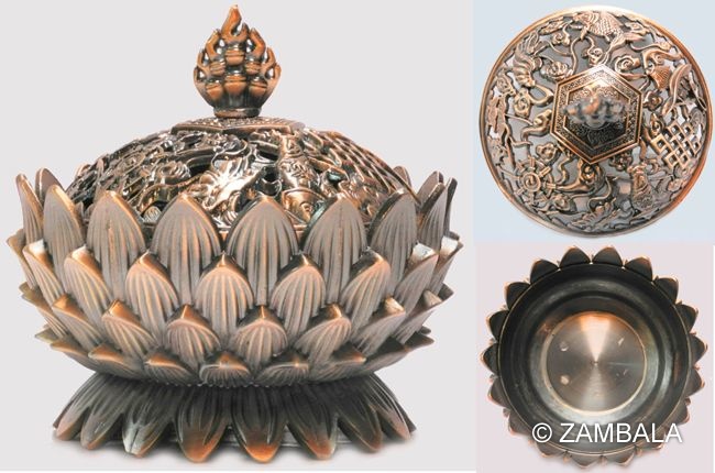 在西藏,香爐起源於苯教(Bon)傳統,逾千年歷史,後融入佛教。 成分如刺柏(淨化)和番紅花(吉祥),爐身常飾以龍或雲紋,象徵力量與保護。
