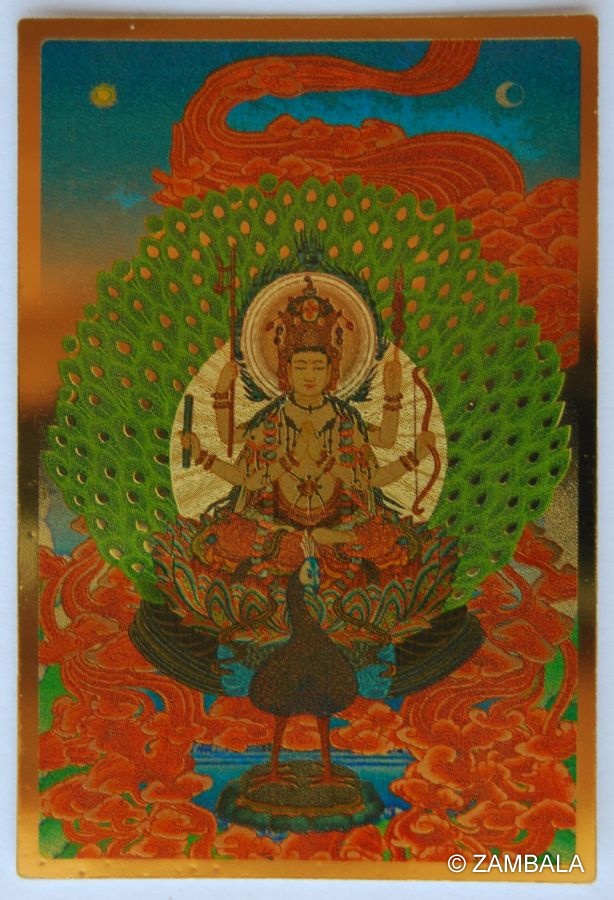 一頭四臂,為菩薩形,駕孔雀,故曰孔雀明王,以「滅一切諸毒怖畏災惱」、「攝受覆育一切有情獲得安樂」為主要特色的本尊。