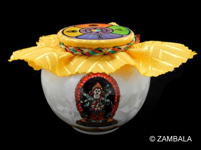 **寶瓶(Yangdzong或Wealth Treasure Vase)** 是藏傳佛教古老的財富薈萃法器,以六臂白瑪哈嘎拉為主尊的寶瓶特別著名(如薩迦寺修製的版本)。寶瓶內裝填珍寶、藥材、聖物、咒語、財神像等,由高僧以嚴格儀軌(如白瑪哈嘎拉修法)加持灌頂,象徵本尊的宮殿與財富能量,能磁引豐盛與吉祥。
