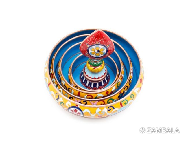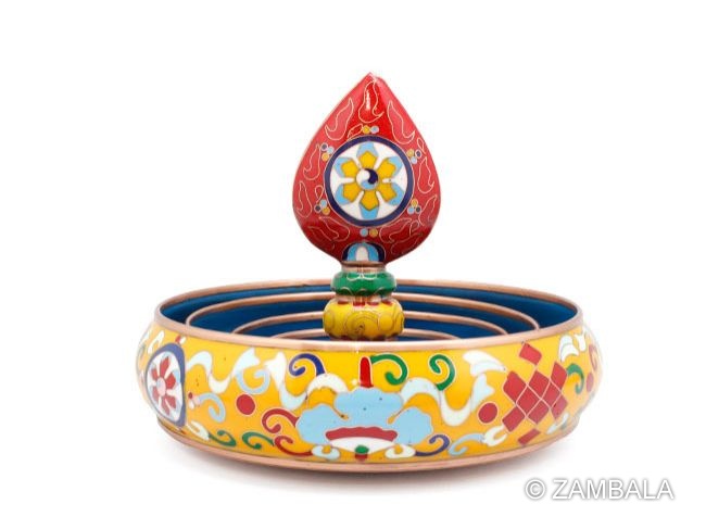 曼達盤通常由多層塔盒和螺頂組成,每層塔盒中空,可裝滿金銀、寶石、糧食等供物。修法時,修行者一邊誦念真言,一邊將供物撒入曼達盤中,逐層堆疊至螺頂,象徵祈願吉祥幸福。