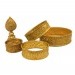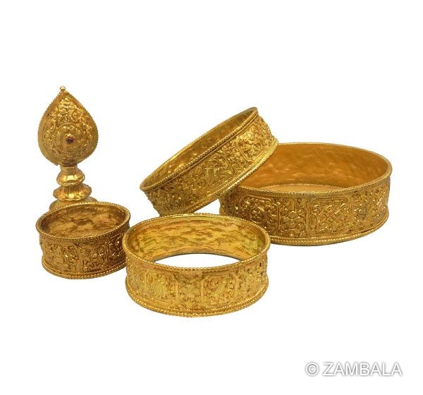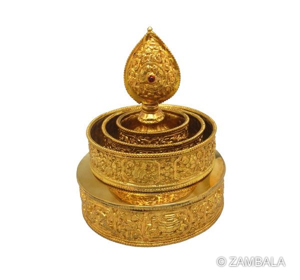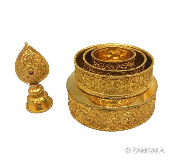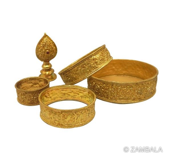 曼達盤通常由多層塔盒和螺頂組成,每層塔盒中空,可裝滿金銀、寶石、糧食等供物。修法時,修行者一邊誦念真言,一邊將供物撒入曼達盤中,逐層堆疊至螺頂,象徵祈願吉祥幸福。