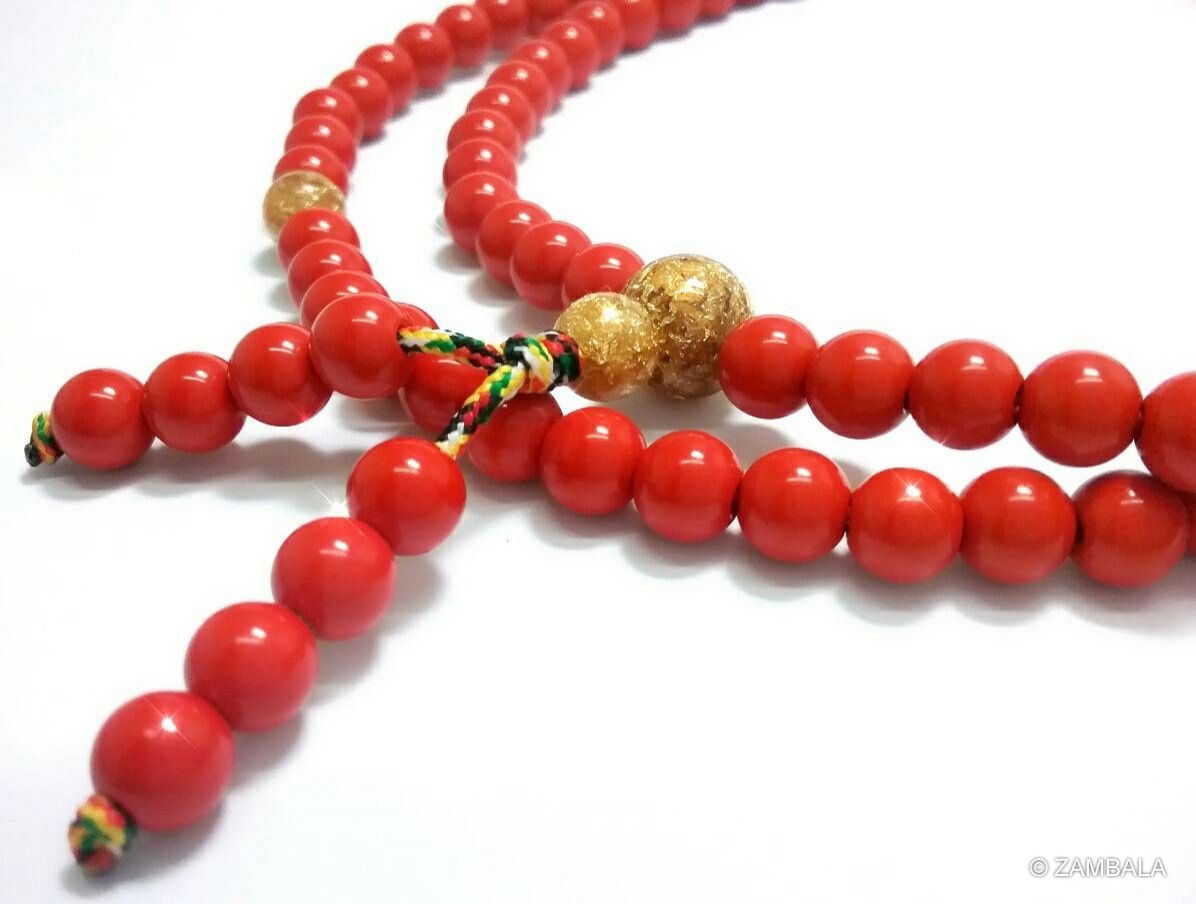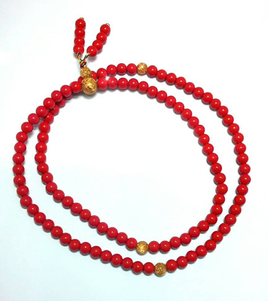 1. **持咒與念經工具**:在日常修持或大型法會(如超度、祈福儀式)中,修行者手持硃砂念珠,一邊撥動珠子一邊默念佛號(如「南無阿彌陀佛」或六字真言「嗡嘛呢叭咪吽」)。108顆珠子對應一次完整的「一圈念誦」,象徵掃除108種人間煩惱(包括貪、嗔、痴等),幫助參與者進入禪定狀態,沉心靜氣、心神安寧。藏傳佛教中,這種念珠常在密宗灌頂或火供儀式中使用,增強咒語的效力。
