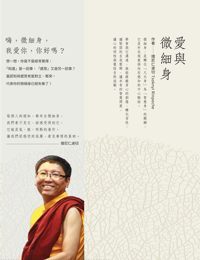 書中仁波切帶領大家從自己的狀態去感受、去覺知身心的各種習性、情緒或疼痛,然後跟你的感知做朋友,也就是不阻擋、不逃離、不評斷、不追隨,讓這些感受自己舒展開來,讓氣、脈、明點回到自己原本的狀態。當它們的自性展現了,所有的感知就是一種證悟的經驗。學會與微細身