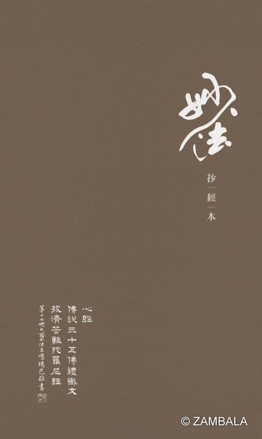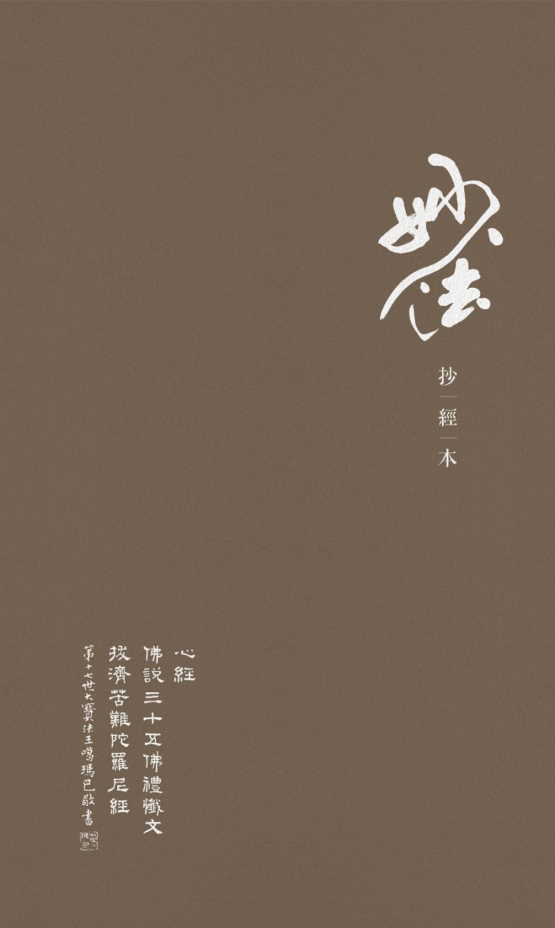 這部《妙法》抄經本收錄了法王親書的三部佛經墨寶:《心經》、《三蘊經.三十五佛懺悔文》和《拔濟苦難陀羅尼經》,抄經者共可抄寫十八篇經文。抄完了《妙法》抄經本十八篇經文,等於領受了佛陀和法王十八次的無上智慧加持。抄完了這本《妙法》抄經本,還可以轉成個人日常修持的課誦本。持續不斷地抄經,您也許可以從字裡行間中,看到自己心境的轉變。