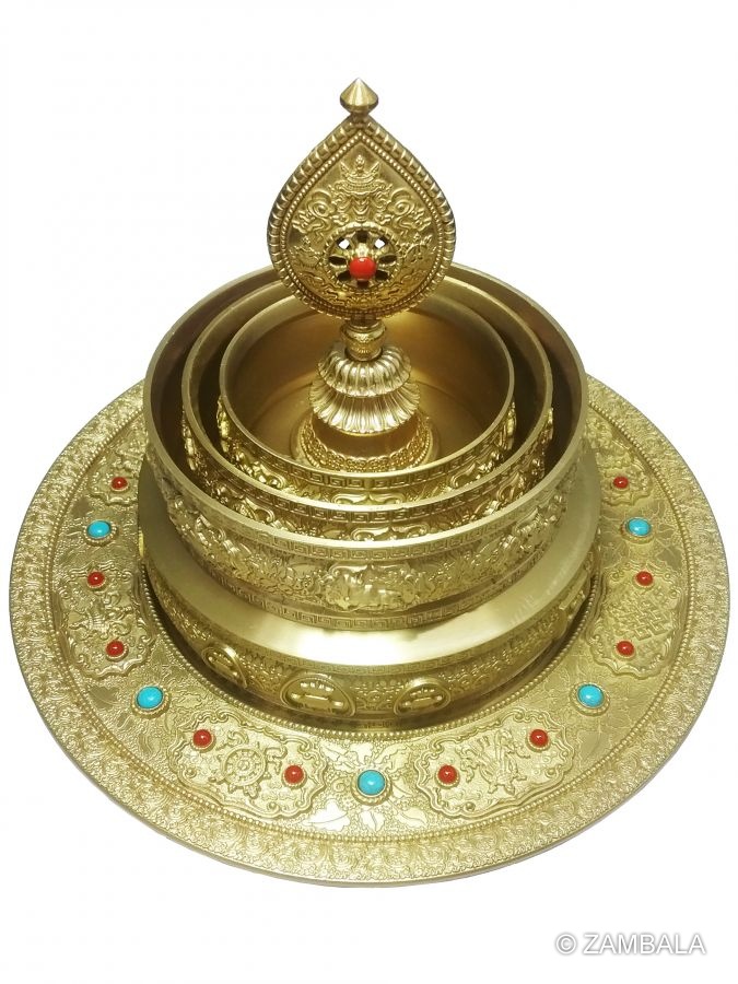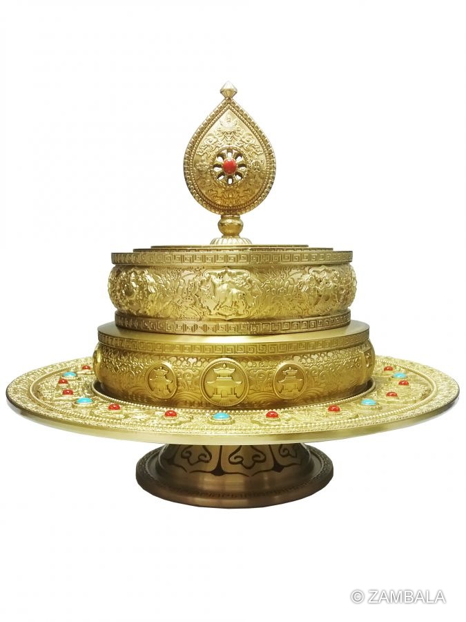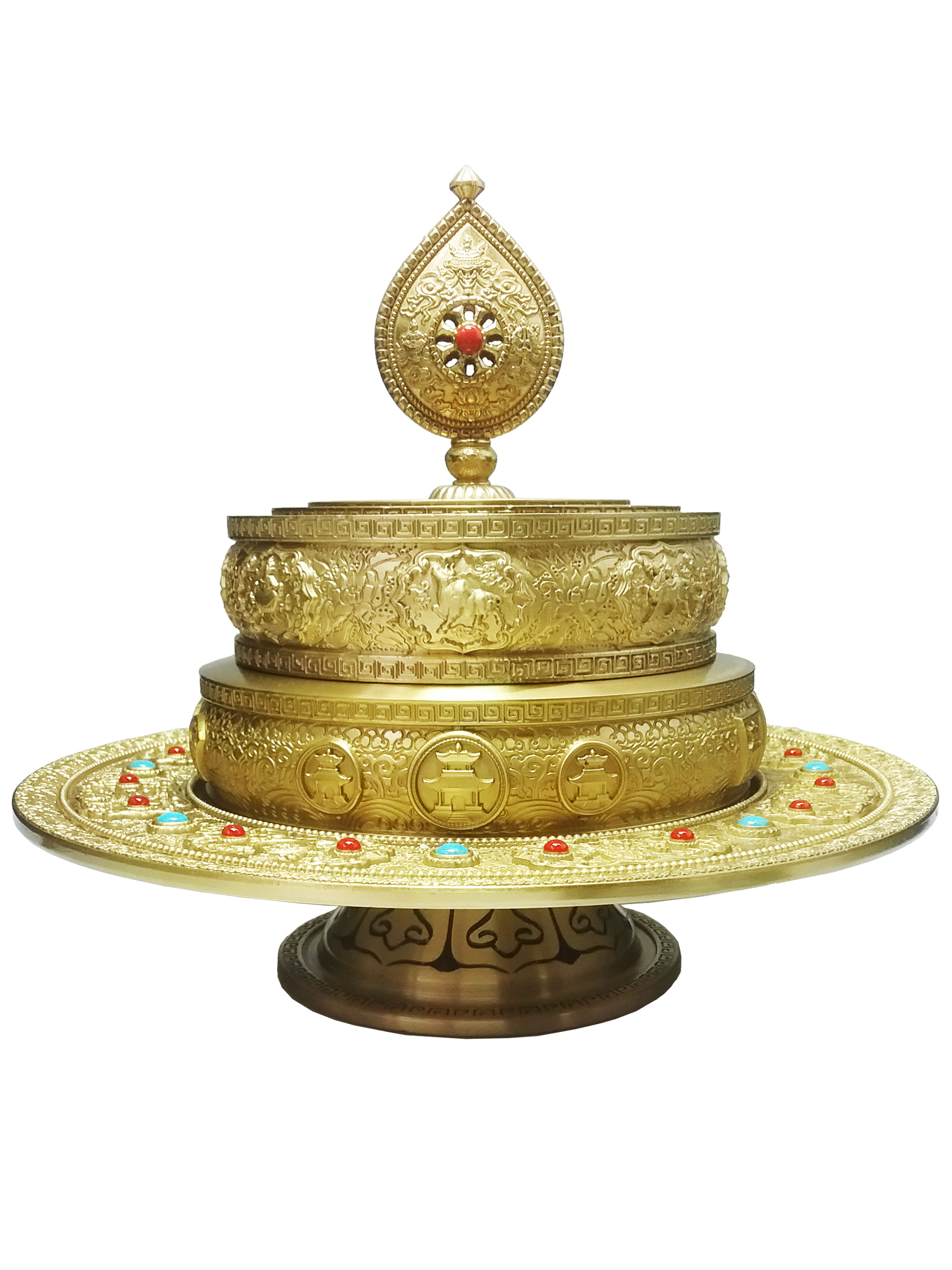 曼達盤通常由多層塔盒和螺頂組成,每層塔盒中空,可裝滿金銀、寶石、糧食等供物。修法時,修行者一邊誦念真言,一邊將供物撒入曼達盤中,逐層堆疊至螺頂,象徵祈願吉祥幸福。
