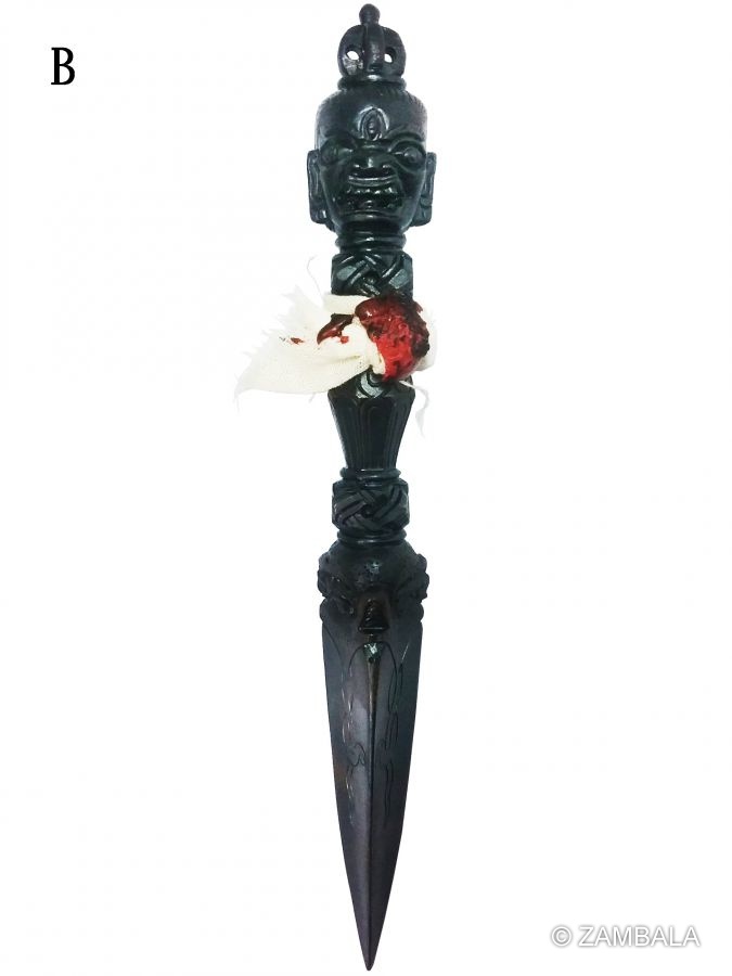 金剛橛原是古印度人破甲用的冷兵器,後來被藏傳佛教吸收為法器,有銅、銀、木、等各種材料製成,外形上大同小異,都是有一尖刃頭,但手把上因用途不同而裝飾不同。有的手柄是佛頭;也有的是觀音菩薩像,頭戴五骼髏冠,最上端又有馬頭。它含有忿怒,降伏的意思。修法時在壇場的四角樹立,意思是使道場範圍內堅固如金剛,各種魔障不能來危害。
