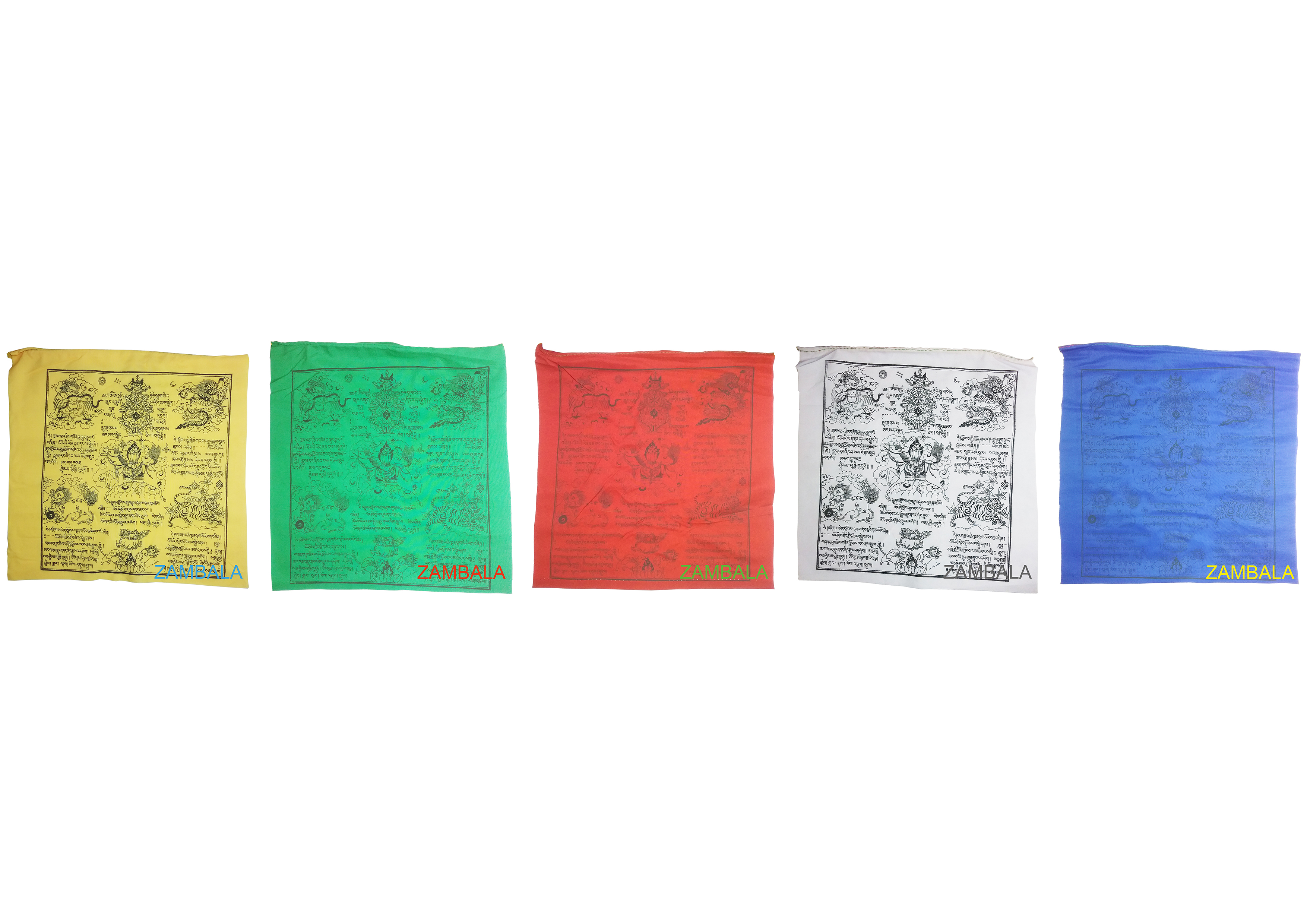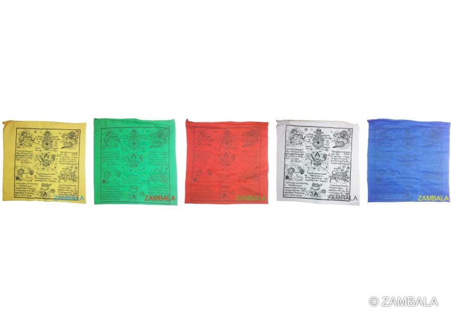 經幡的四角印有四種瑞獸(大鵬鳥代表智慧、龍代表力量、獅代表無畏喜、虎代表信心)