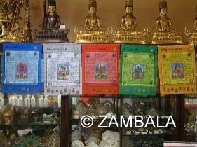 五種不同的設計上印有5種顏色的滌綸面料,並縫上的水平顯示繩索:藍 - 長壽標誌由黑色Zambala(黑財神殿),懷特海淨化旗白Zambala(白財神殿),紅 - Wishfufilling代表國旗由紅Zambala(紅色財富的神),格陵蘭磁化標誌由綠Zambala(綠色財富的神),和黃色 - 豐富國旗由黃Zambala(黃財神殿)。他們來預先縫在台5面旗幟。這些都是很有見地的,並持續更長的時間比大多數經幡和它的顏色不容易褪色。經幡上印有上述財富的神,祈禱和咒語的神聖形象。有人說,只要觸動他們的風道,將隨身攜帶的祈禱的有益力量,以滿足任何人。因此帶來更多的財富。