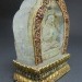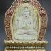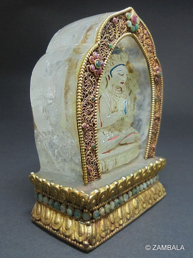 四臂觀音是佛菩薩之菩提心所化現﹐是很久以前已成正等正覺之古佛﹐稱為「正法明如來」﹐為救度不同眾生而示現不同的相﹐世人稱為大慈大悲的觀世音菩薩﹐與娑婆世界之眾生特別有緣﹐因為他經常示現救度眾生﹐因此觀世音菩薩最為受人供奉。四臂觀音的報身相中﹕白色身代表清淨無暇﹐四臂代表四種佛行﹐即「息」、「增」、「懷」、「誅」等。「息」是平息所有的痛苦、障礙及困難。「增」是增加福報、智慧、長壽、財富等。「懷」是救度眾生、領導他們修行。「誅」是誅滅眾生種種惡念、克服外界魔障等。四臂的手﹐前兩隻合十胸前﹐抱著一顆如意寶珠﹐代表能滿足所有眾生的要求。另外的兩隻是﹕右手持一串水晶念珠﹐代表不停地救度眾生。左手持一朵蓮花﹐代表清淨的心﹐沒有暇疵。觀世音的左邊肩膀披上一塊鹿皮﹐是代表慈悲及純正的心﹐而頭頂上戴著的五方佛冠是代表五方的智慧﹐其它所穿著的綢緞及瓔珞都是代表莊嚴的報身相﹐而雙腿雙盤的金剛坐姿是代表穩固禪定的境界。總括以上六種裝飾代表六度萬行的成就。坐在月盤上代表慈悲方便的法﹐月盤下之蓮花﹐代表清淨的境界。
