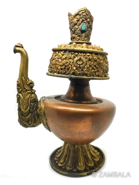 在佛教中,Kalasha 從公元前1世紀開始出現於藝術和建築中,如寺廟柱子和屋頂的裝飾圖案。 當佛教傳入西藏後,演變為Bumpa,融入藏傳密宗的儀式系統。Bumpa 被視為佛教八吉祥物(Ashtamangala)之一的「寶瓶」(Treasure Vase),象徵無盡的財富、智慧和佛的品質(yonten)。 這一轉變反映了佛教從印度教借用符號的歷史,強調內在精神豐盛而非物質財富。寶瓶的設計通常包括噴嘴,便於灑水,這是藏傳佛教獨有的實用適應。