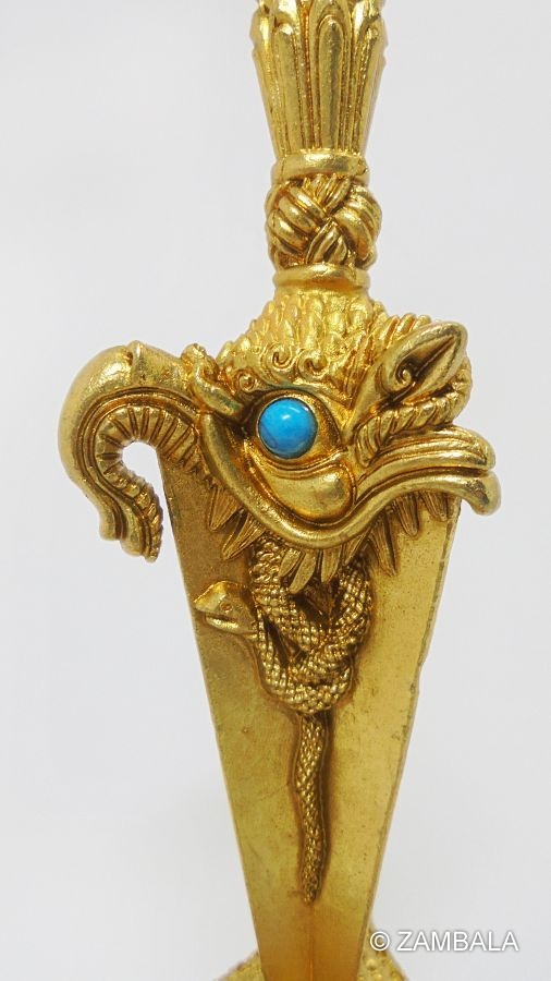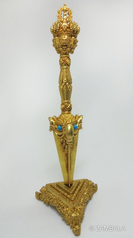 製作材料:金屬與寶石: 普巴杵的製作材料包括金屬,並可能鑲嵌有各種寶石。這些寶石代表著法器的神聖性和力量。寓意深遠:三界的超越: 三面刀鋒象徵著超越生、死、和中間地獄的三個界域。它強調了法器的超凡性質,與個人的靈修進程相關。總的來說,普巴杵在藏傳佛教中是一種具有神聖象徵的法器,其使用涉及到淨化、保護,以及超越障礙的層面。