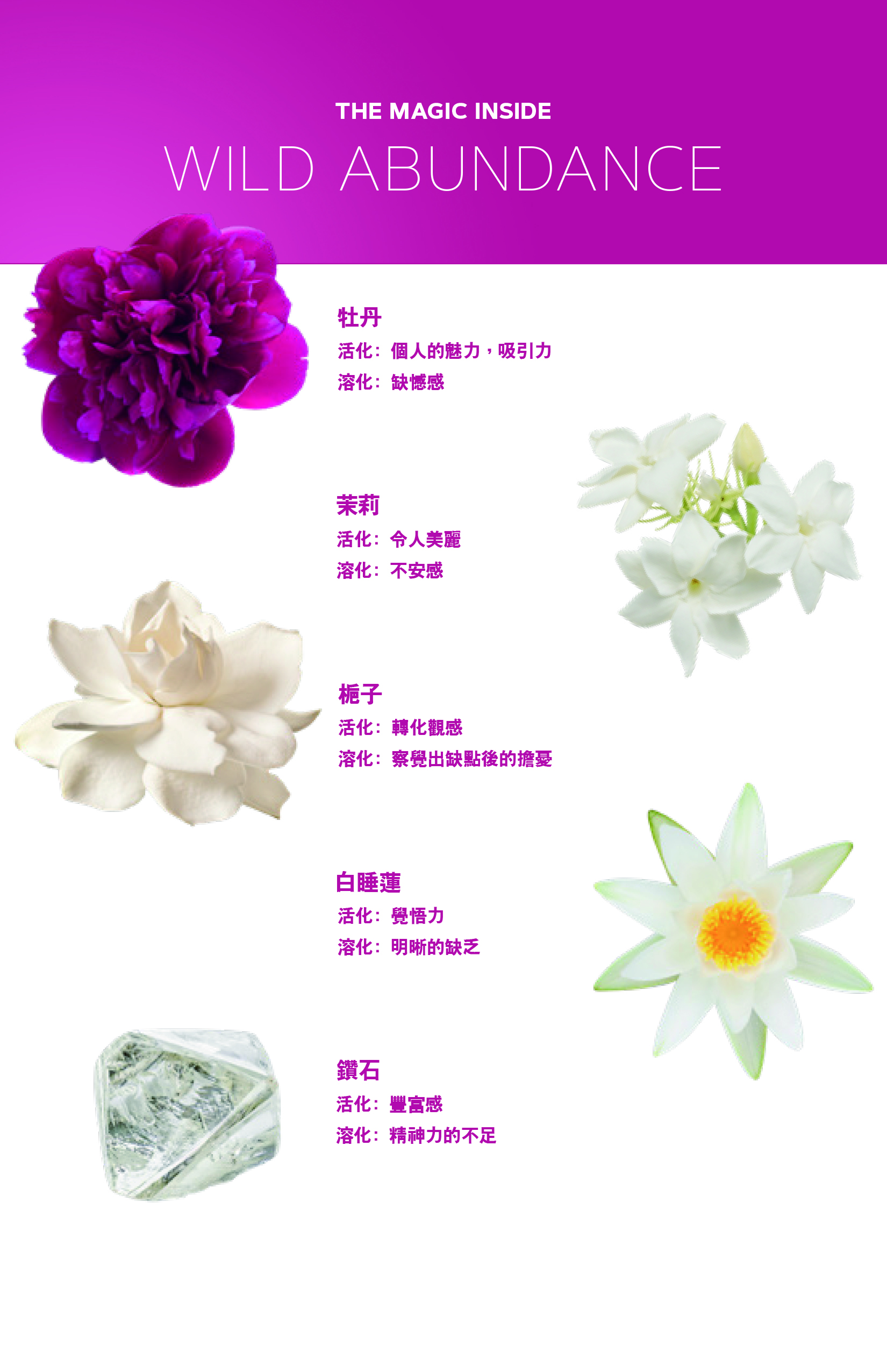 花精(炁)(波): 牡丹(Paeonia lactiflora), 梔子(Gardenia jasminoides ), 小花茉莉(Jasminum sambac), 白睡蓮(Nymphaea odorata), 西洋蓍草(Achillea millefolium), 白蓮花(Nelumba nucifera)