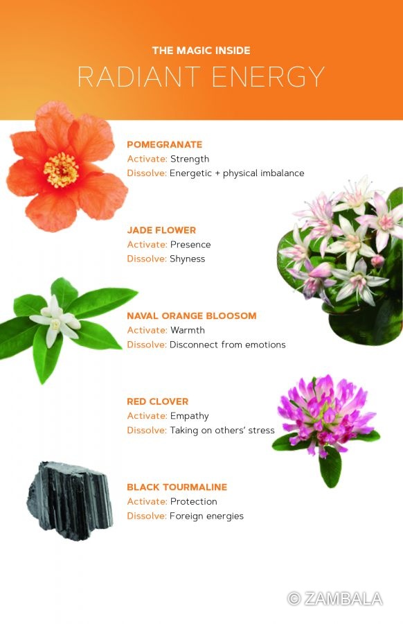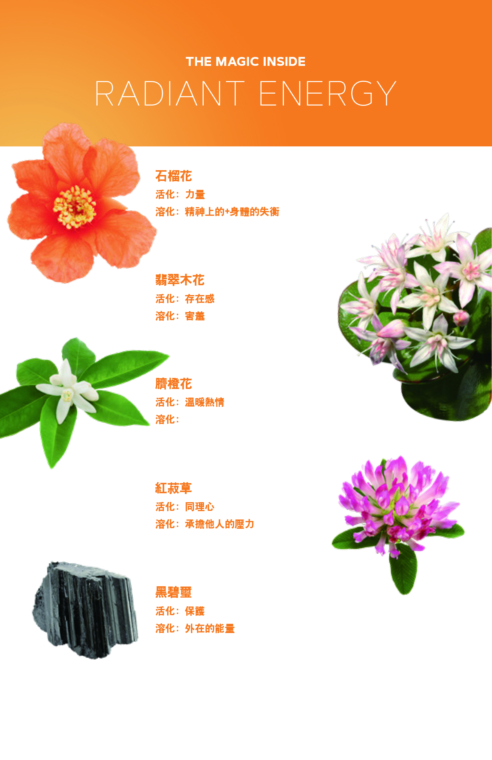 花精(炁)(波): 石榴花(Punica granatum), 臍橙花(Citrus sinensis), 紅菽草(Trifolium pretense), 翡翠木花(Crassula ovata), 西洋蓍草(Achillea millefolium), 白蓮花(Nelumba nucifera)