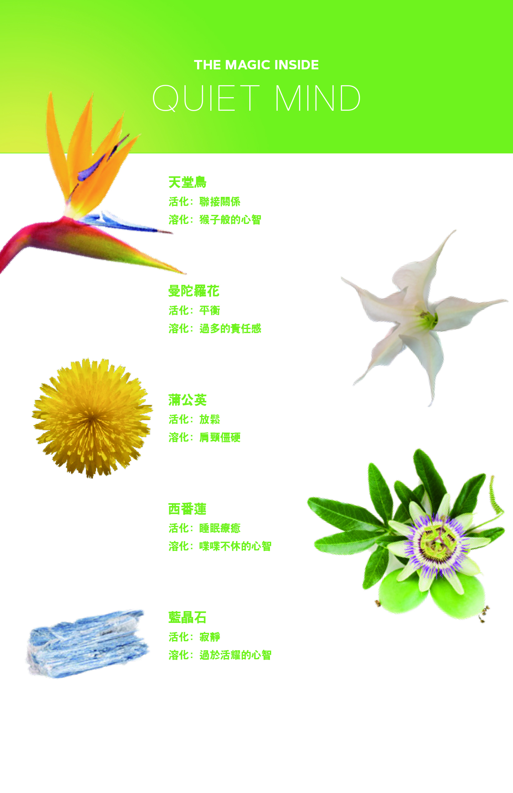 花精(炁)(波): 天堂鳥(Strelitzia reginae), 西番蓮(Passiflora incarnata), 曼陀羅花 (Brugmansia arborea), 蒲公英(Taraxacum officinale), 西洋蓍草(Achillea millefolium), 白蓮花(Nelumba nucifera)