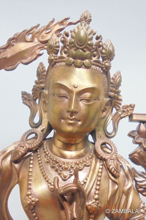 文殊菩薩的名字意譯為「妙吉祥」,象徵著智慧的純淨與吉祥。他的形象最早出現在《華嚴經》中,與普賢菩薩一同輔佐釋迦牟尼佛,並與佛陀、普賢菩薩並稱為**華嚴三聖**。