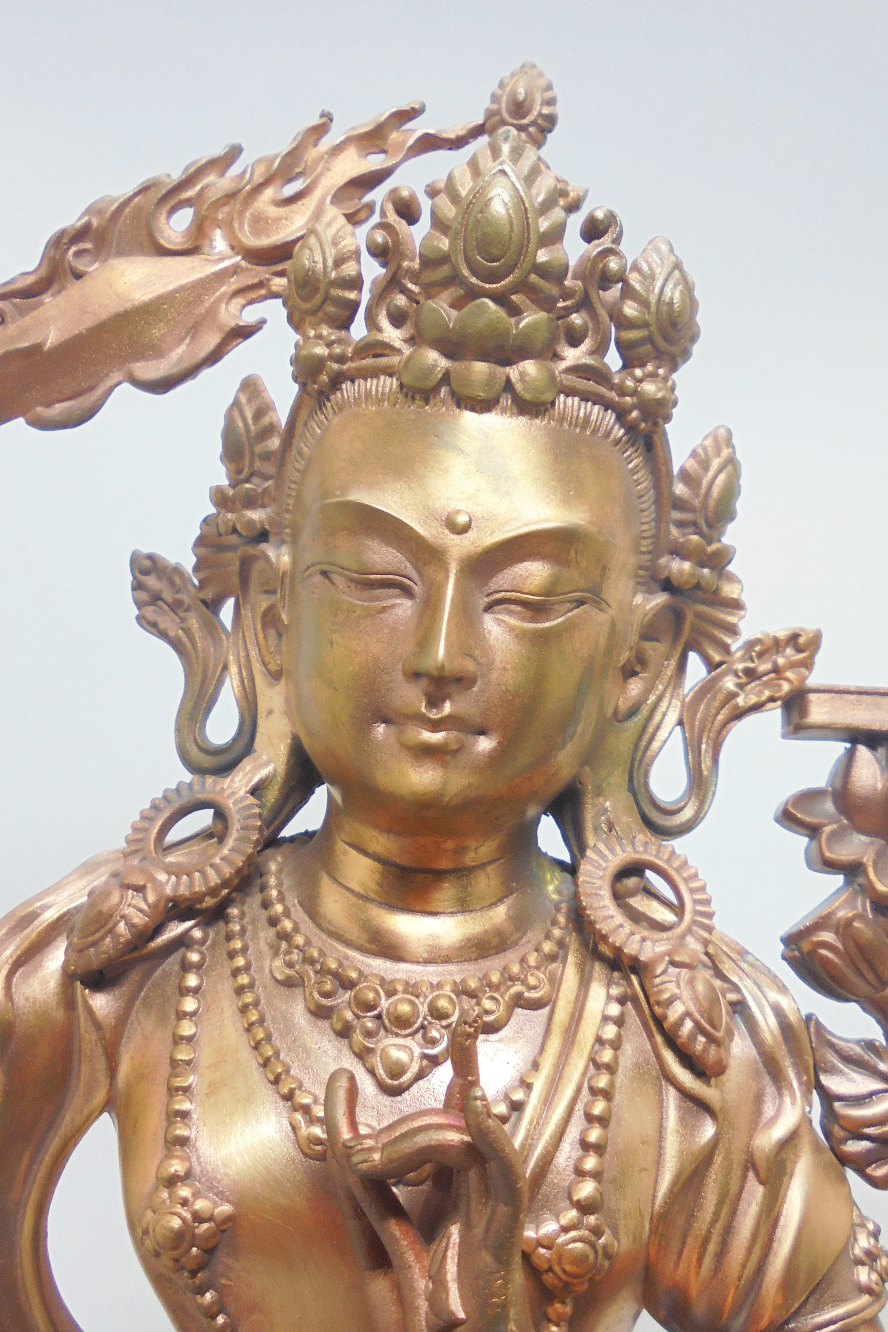 - **左手持蓮花**:蓮花上有般若經卷,代表清淨無染的智慧。