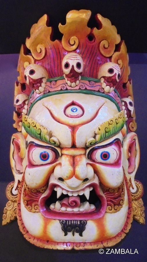 瑪哈嘎拉面具在藏傳佛教中是護法神瑪哈嘎拉的象徵,代表慈悲與智慧的忿怒化現,用以保護佛法、驅除障礙,並引導修行者。其由來融合了印度佛教與藏傳佛教的傳統,通過儀式與藝術形式展現其神聖力量。面具不僅是宗教法器,也是藏族文化中重要的藝術與信仰象徵。