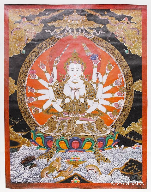 「準提」譯為清淨或明覺,令說不空,絹索。此尊法相分二臂、四臂、六臂、八臂、十臂、十二臂、十八臂、三十二臂、八十四臂等,此尊三目十八臂,中央二手結準提印。依經所云:佛母準提陀羅尼,若有四眾,受持此咒,滿九十萬遍,無量劫來,五無間等,一切諸罪,悉滅無餘,所在生處,接得遇諸佛,所有資具,隨意充足,速得成就,無上菩提。