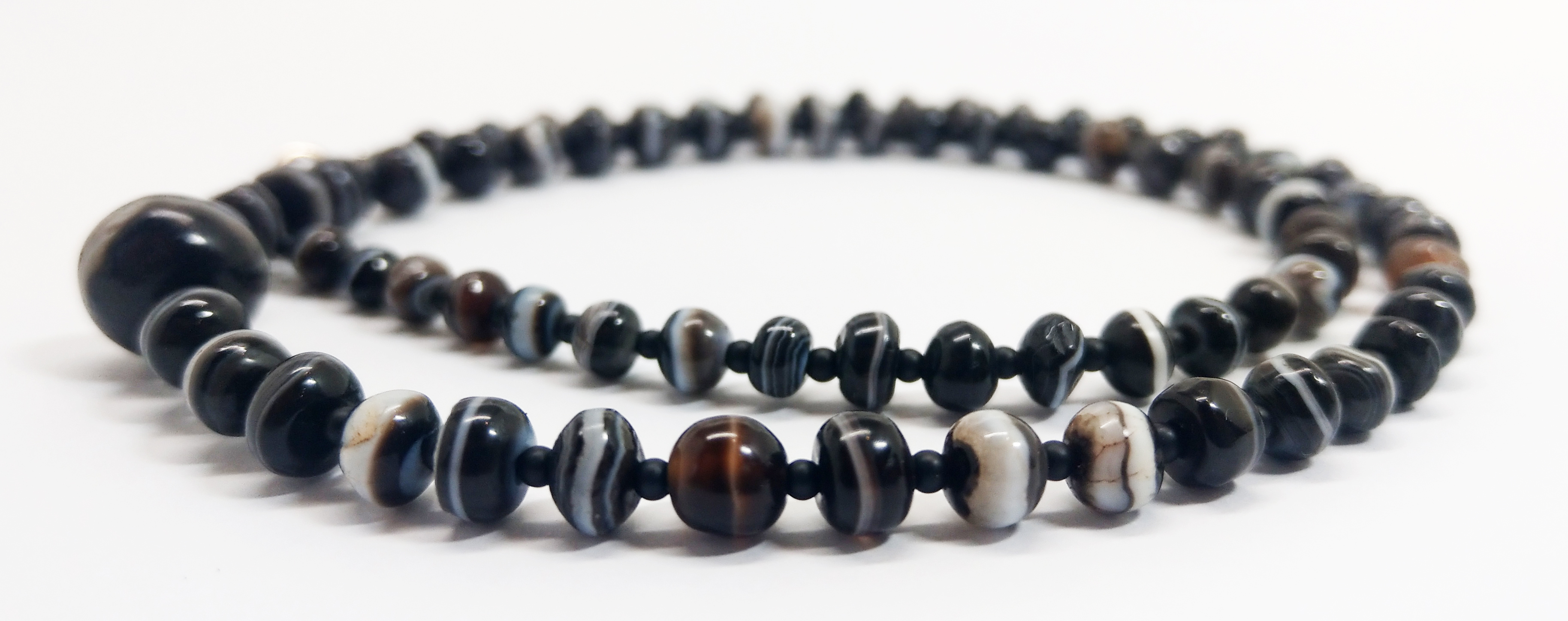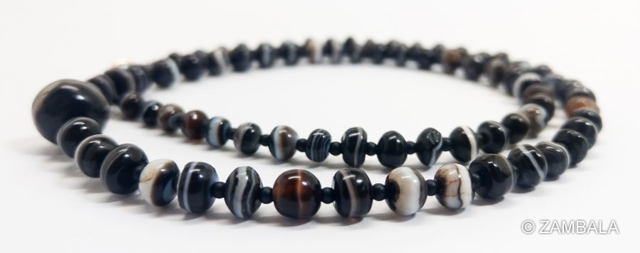 1. **傳說與藥師佛的關聯**:據藏傳佛教傳說,藥師佛手持此珠作為念珠,珠子上的一條白線象徵佛眼,能庇佑眾生免除病痛與災厄。早期西藏藥師(藏醫師)外出為病患診治時,會佩戴白線條黑瑪瑙串成的藥師珠,將其磨成粉末入藥治療,故得名「藥師珠」。這反映了其在藏醫學中的實用價值,上乘品質的藥師珠甚至可直接入藥。