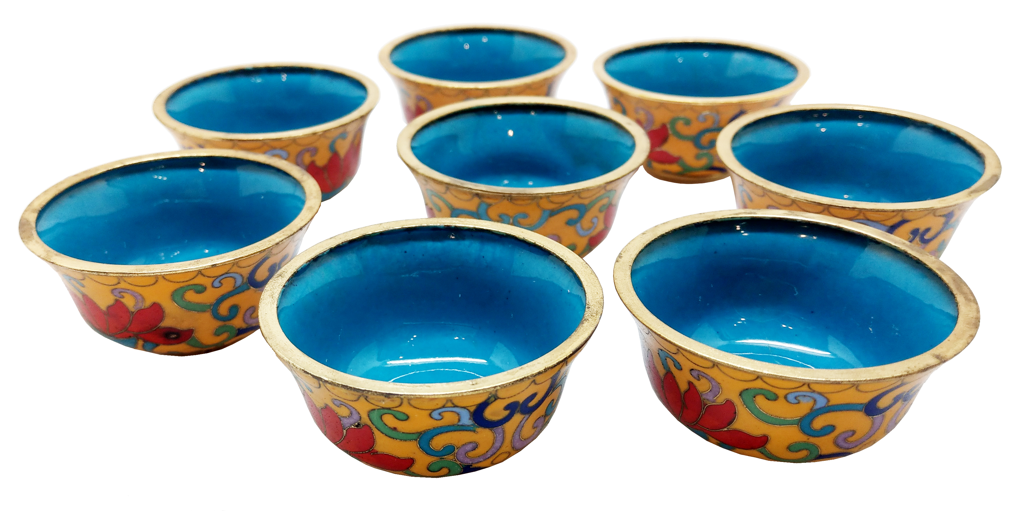 景泰藍八供杯是藏傳佛教中常見的供養器具,以中國傳統掐絲琺瑯工藝(即景泰藍)製作而成。景泰藍工藝起源於元代,由拜占庭經伊斯蘭地區傳入中國,明代景泰年間達到巔峰,清代宮廷因崇信藏傳佛教而廣泛應用於佛教器物製作,如供杯、佛像等。這些杯子通常成組八個,用於盛放八種供品(簡稱八供),是佛教徒日常修持的重要部分。下面我從其在藏傳佛教中的影響地位,以及神話故事由來進行敘述。