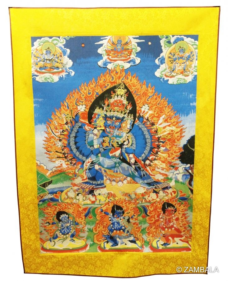 - 唐卡、雕塑與寺院壁畫中,他通常被描繪為藍黑色身,火焰環繞,氣勢懾人,反映其強大的護法力量。