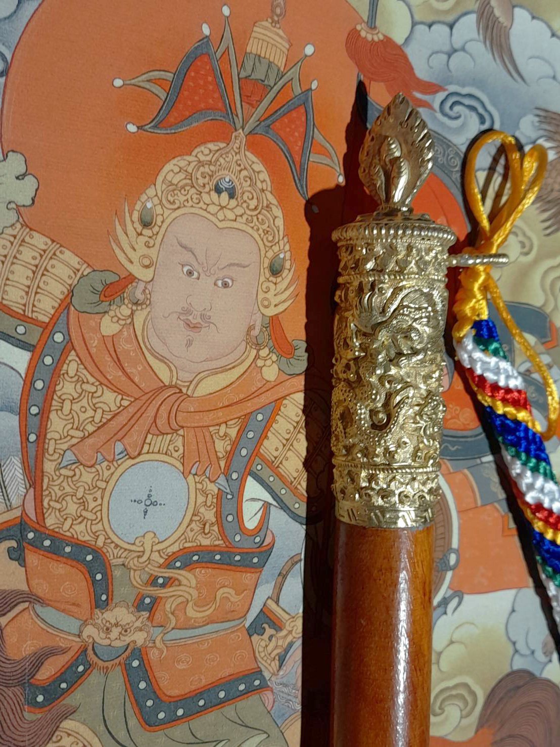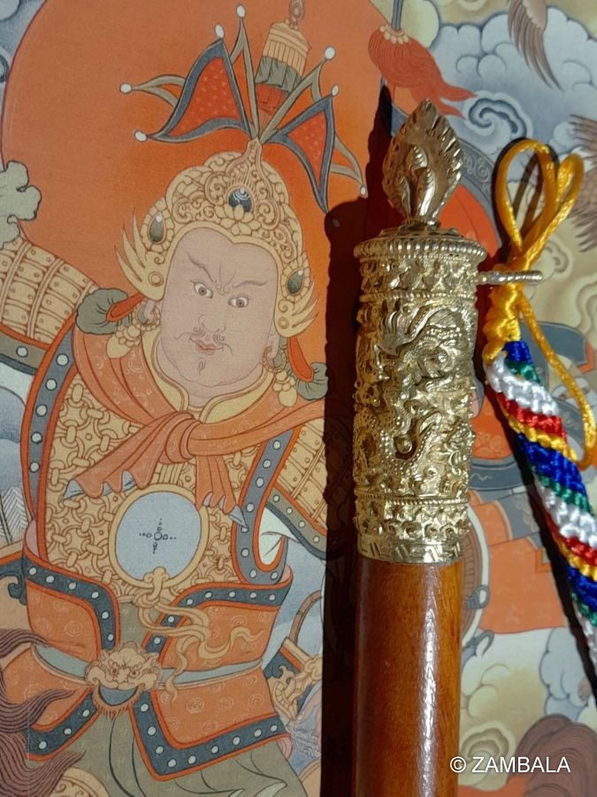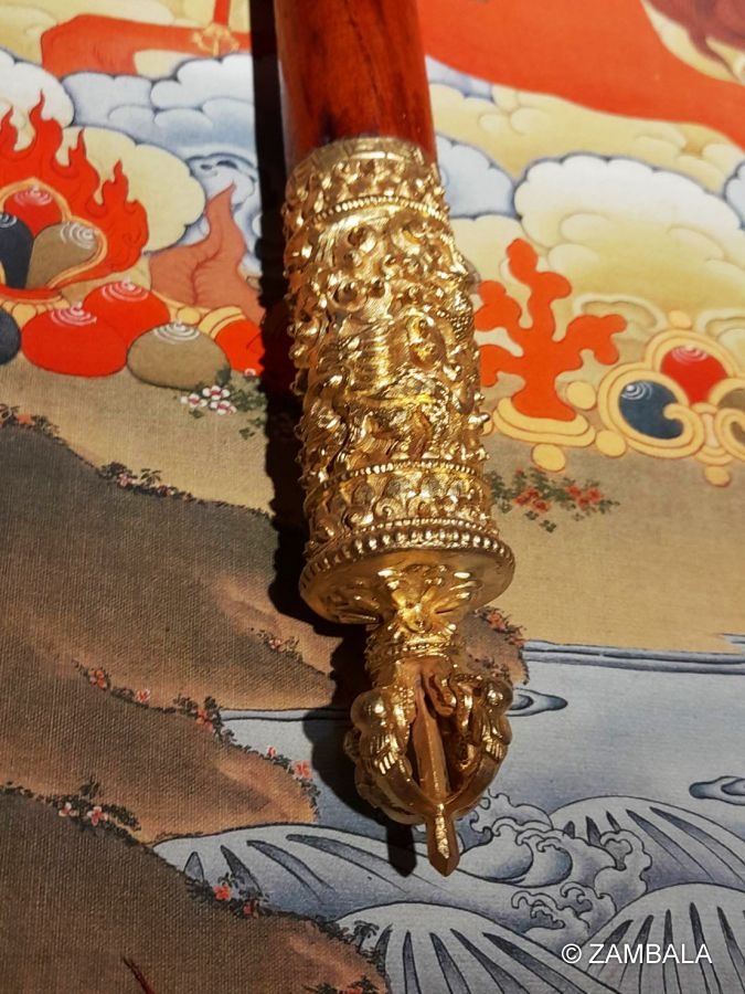 是緣起善妙吉祥而且具有財運福氣之法器,能幫助各種事業相續不斷。現今亦為增長自他利樂、以及令此世間無盡吉祥順利之故,吾等依照米滂仁波切勝心密意之傳承規則程序,以正確具量之咒語、禪定、聖物修製完成此「心想事成權杖」,故而此權杖與給薩爾戰神王手持之法器無有差別,具備與 格薩爾王手中權杖無有差別之加持與威德。
