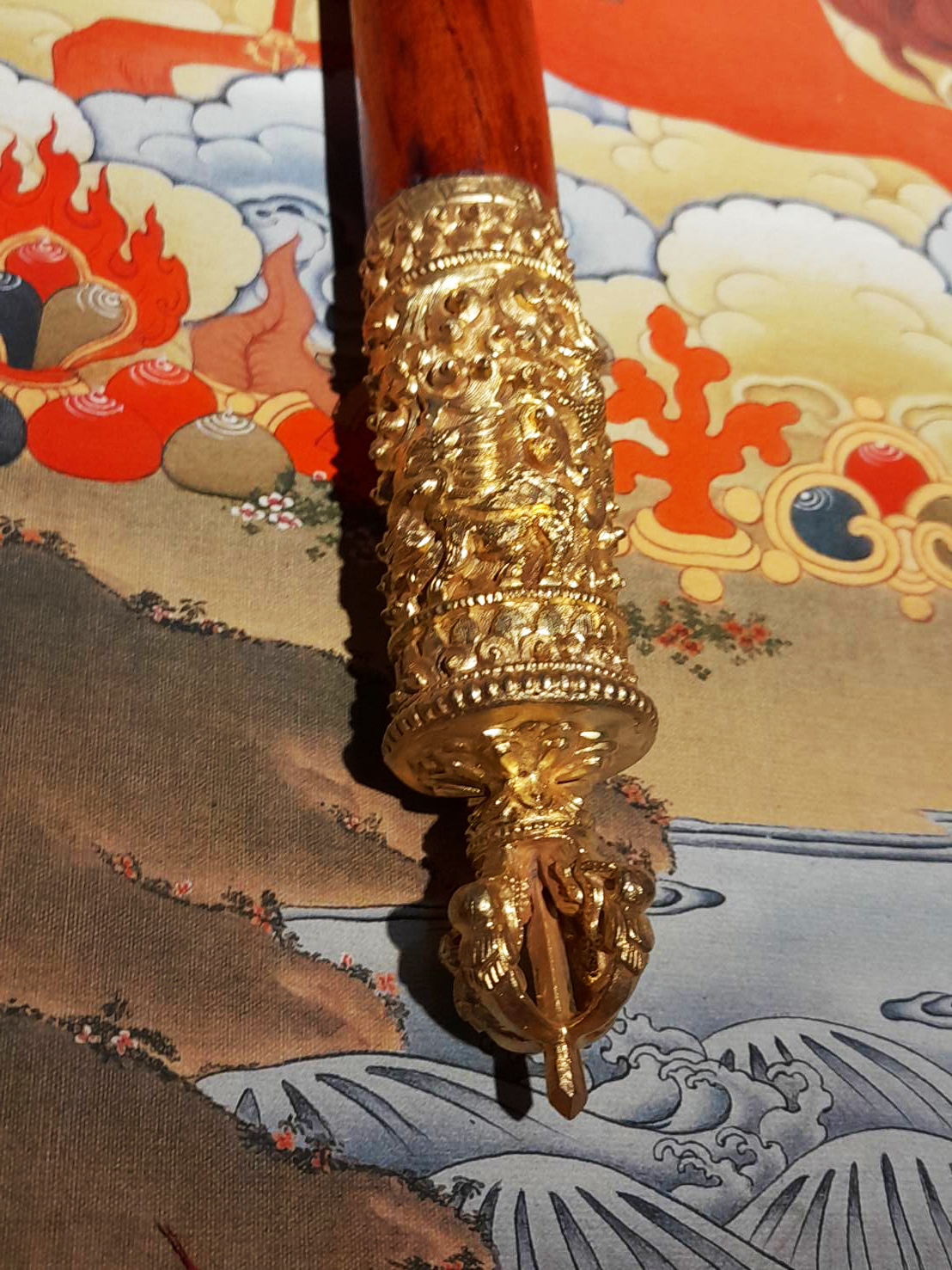 心想事成權杖乃是以妙吉祥菩薩、觀世音菩薩、金剛手菩薩、蓮華生大士、格薩爾戰神王為主之三根本與諸護法、財神等,猶如密蜂不離鮮花一般,自然圍繞盤聚之所依堡壘與魂石。