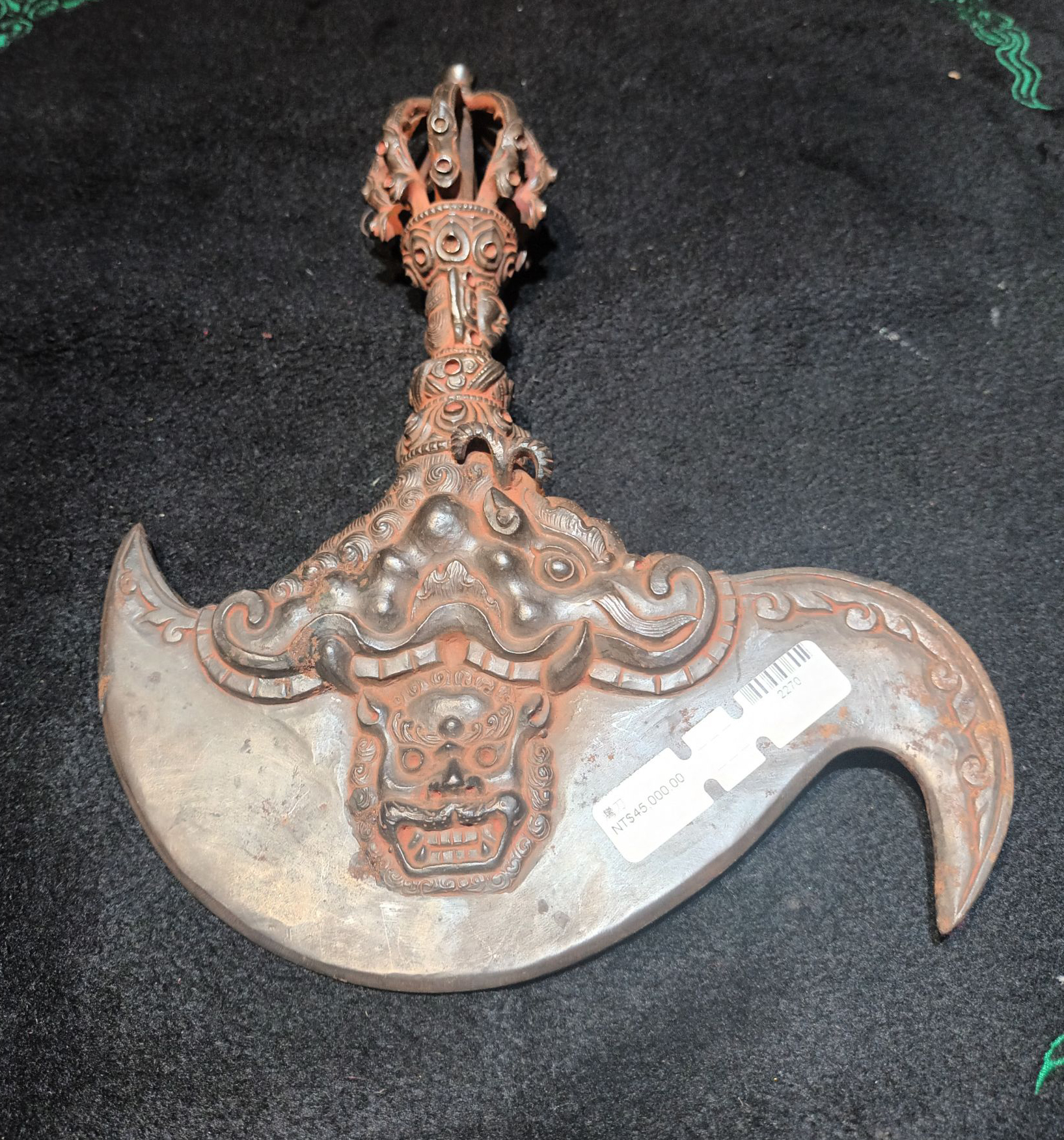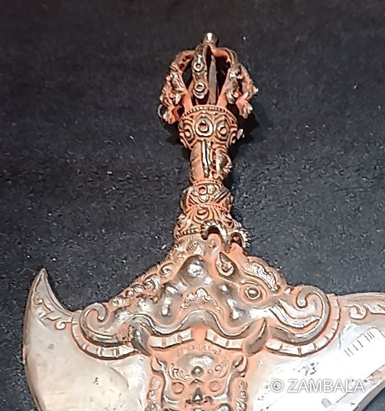 是藏傳佛教常見的法器,代表神聖佛法不容侵犯,衛護佛法之心,如藏傳佛教的虎面空行母、獅面空行母、大威德金剛、瑪哈嘎拉的造像都有手臂持鉞刀。