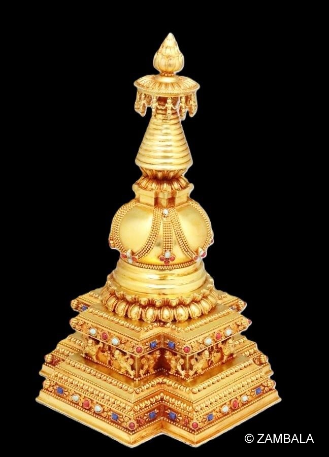 - **塔基**:鐘形,象徵金剛座與六脈輪(中脈),下方蓮瓣代表出離心與十善。