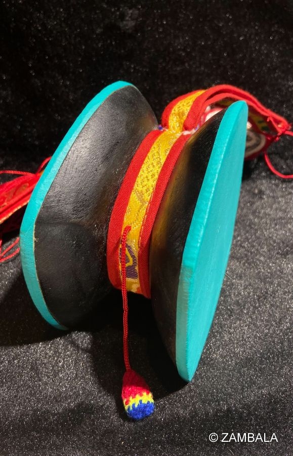 藏傳佛教的手搖鼓,通常稱為**嘎巴拉鼓**(藏語:扎瑪茹),是一種重要的法器,常見於密宗修法儀式中。這種鼓的材質多樣,有木製、骨製等種類,並且通常與**金剛鈴**、**金剛杵**等法器一起使用。