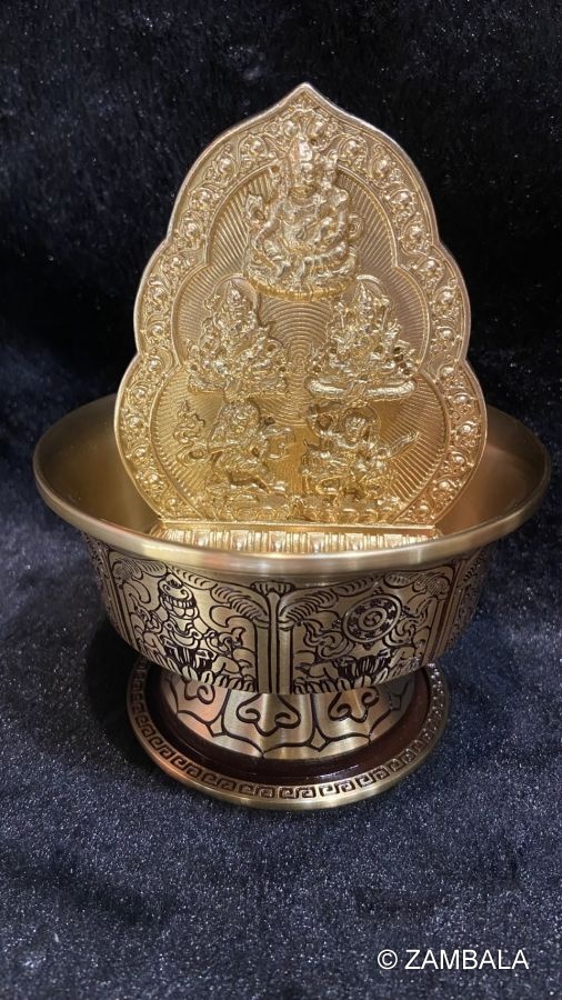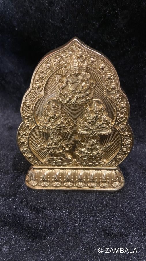 - 形象:黑色皮膚,怒面三目,右手捧嘎巴拉,左手拿吐寶鼠,踏於蓮花月輪之上。