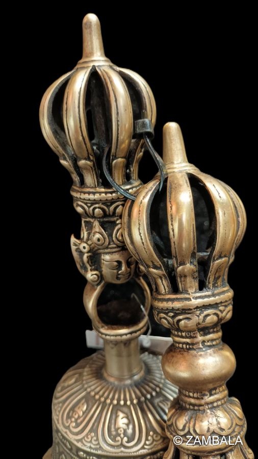- 鈴身下寬上窄,上部飾以小型金剛杵(常為九股),內有舌鐺,搖動時發出清脆聲響。象徵「般若智慧」(空性與女性原則),代表佛身(上部)、佛語(聲音)與佛心(舌鐺內的金剛)。