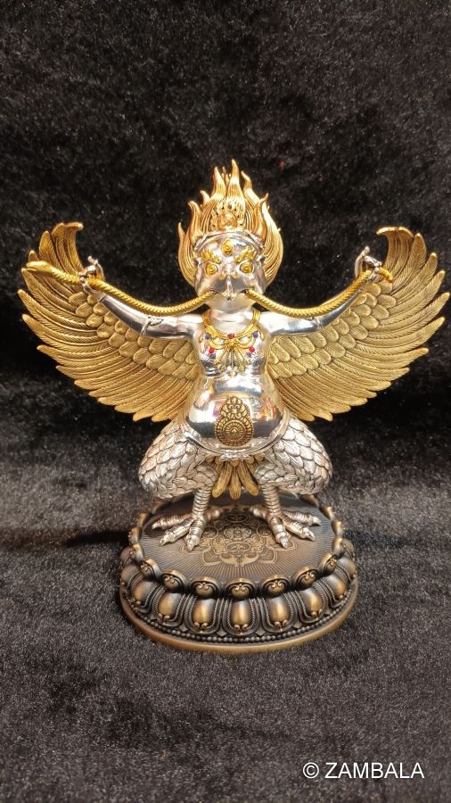 在藏傳佛教中,**金翅鳥**(迦樓羅,梵語:Garuḍa)是一種強大的護法神祇,屬於**天龍八部**之一,象徵**威力、勇猛與驅除障礙**。它的形象源自印度神話,並在佛教傳統中演變為護持佛法的神聖存在。