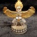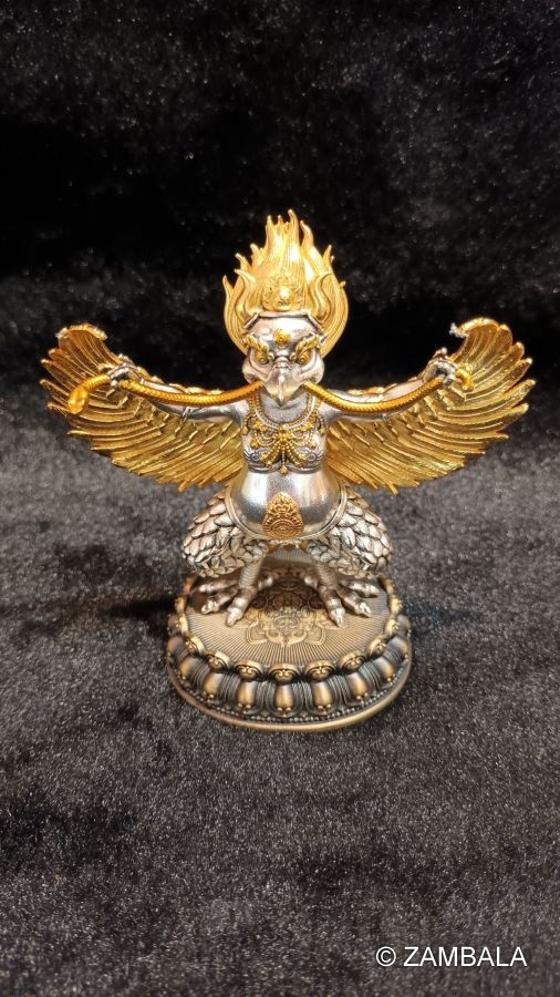 在藏傳佛教中,**金翅鳥**(迦樓羅,梵語:Garuḍa)是一種強大的護法神祇,屬於**天龍八部**之一,象徵**威力、勇猛與驅除障礙**。它的形象源自印度神話,並在佛教傳統中演變為護持佛法的神聖存在。