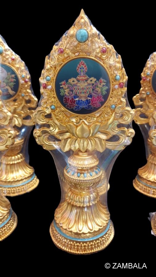 4. **寶瓶**(བུམ་པ་):象徵智慧與福德的圓滿,代表修行者能獲得無盡的法財與加持。