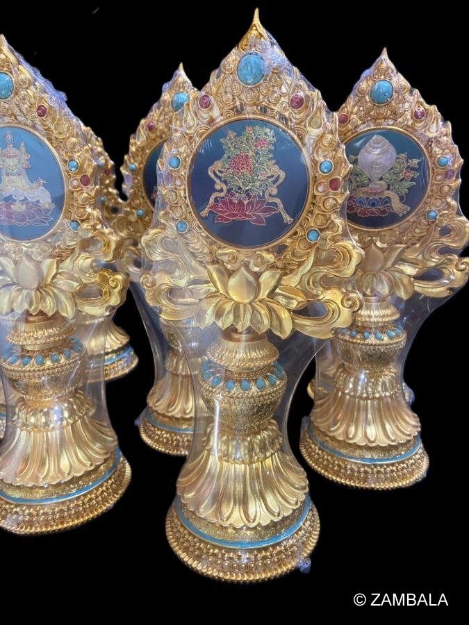 4. **寶瓶**(བུམ་པ་):象徵智慧與福德的圓滿,代表修行者能獲得無盡的法財與加持。