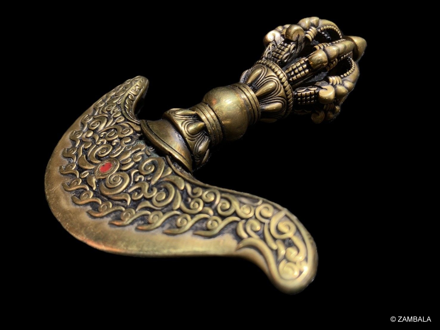 - 九股彎刀杵也可作為禪定輔助工具,幫助修行者專注於普巴金剛的忿怒相,淨化負面情緒並增強降伏障礙的力量。