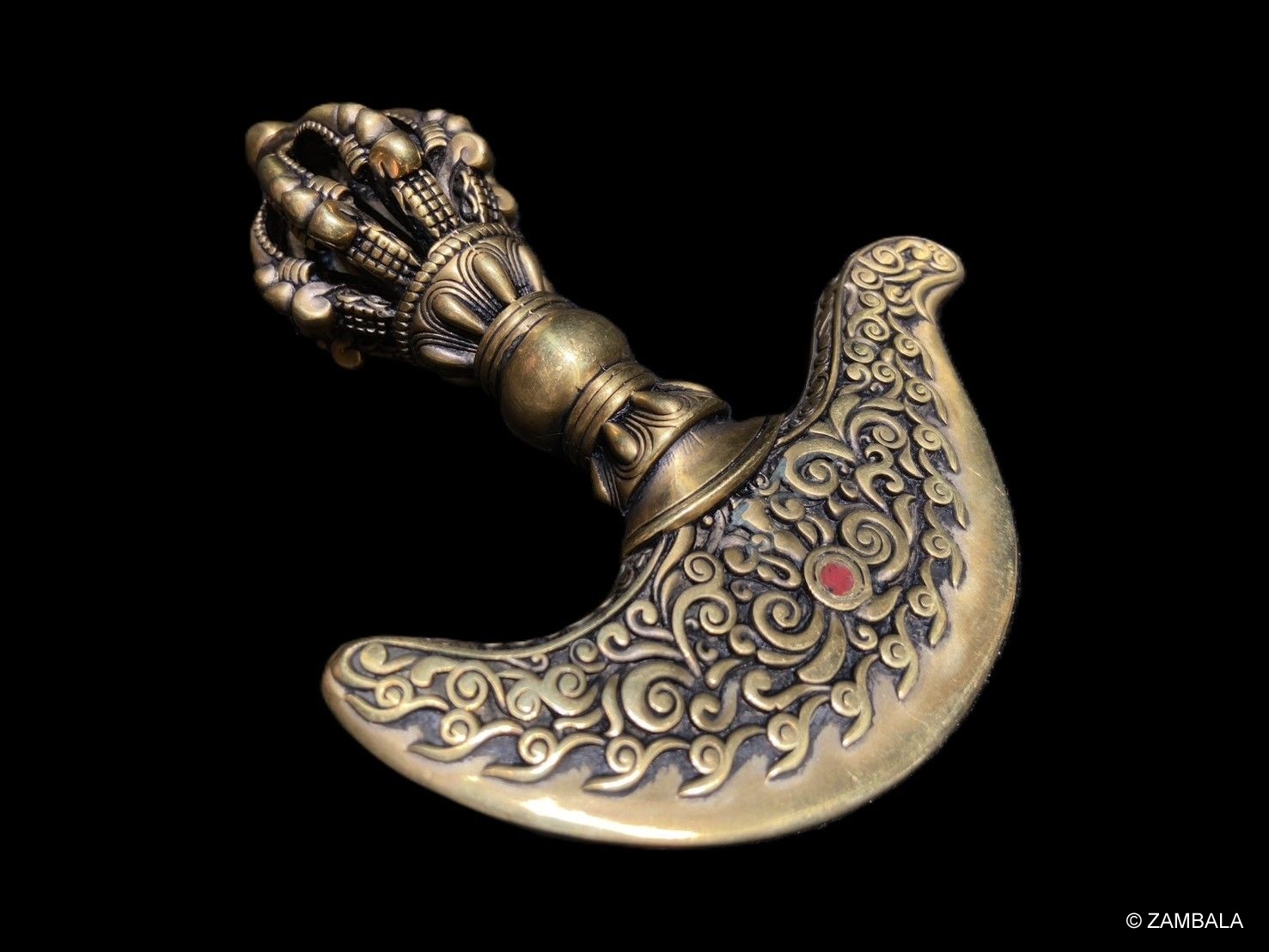 - **安置與供奉**:九股彎刀杵通常安放在普巴座上,置於壇城中央或修法壇前,作為普巴金剛的象徵。在修法前,需以清淨水、薰香或甘露丸淨化杵身,確保其清淨與加持力。